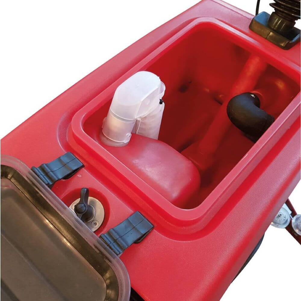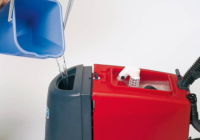 Czerwonym kolorem oznaczony jest zbiornik wody brudnej o pojemności 38 l. Przejrzysta komora zbiornika zapewnia kontrolę nad poziomem brudnej wody oraz ewentualnego pienienia.