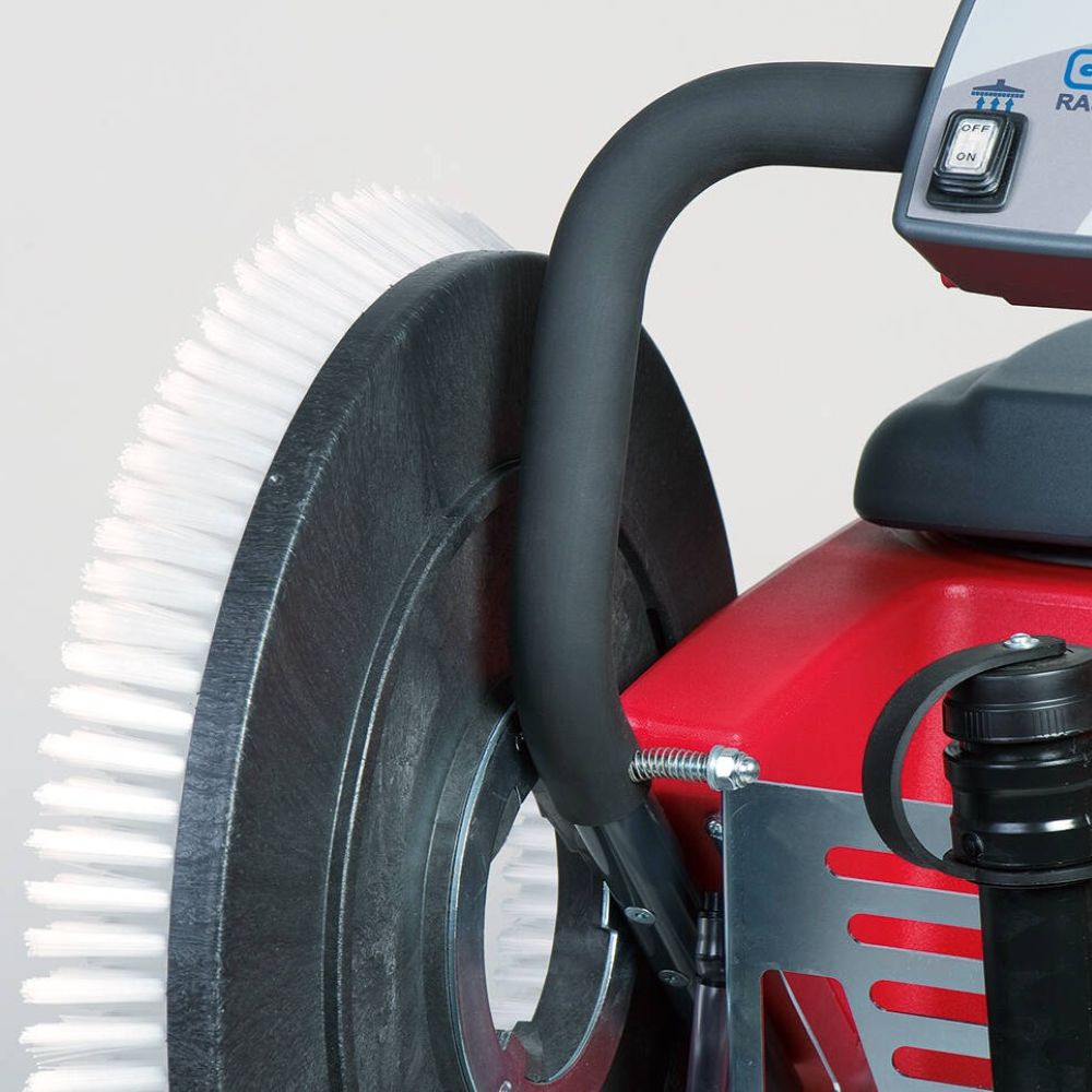 Maszyna czyszcząca RA 505 IBC została zaprojektowana z myślą o maksymalnym ułatwieniu pracy operatora. Mimo braku własnego napędu, jej konstrukcja jest doskonale wyważona, a duże koła transportowe minimalizują opory toczenia. Dzięki temu prowadzenie i manewrowanie urządzeniem o wadze 164 kg jest znacznie lżejsze, niż mogłoby się wydawać. Ergonomiczny uchwyt zapewnia pewny chwyt i precyzyjną kontrolę nad maszyną, co redukuje wysiłek fizyczny podczas dłuższych cykli sprzątania. Kompaktowe wymiary (1450 x 560 x 1130 mm) dodatkowo ułatwiają pracę w ciaśniejszych przestrzeniach i przejazd przez standardowe drzwi.