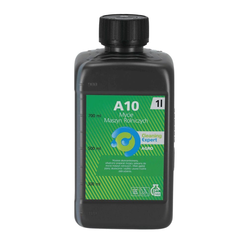Cleaning Expert A10 to wysoce skoncentrowany alkaliczny preparat myjący przeznaczony do profesjonalnego czyszczenia maszyn rolniczych, który dzięki efektowi gęstej piany skutecznie i szybko usuwa trudne zabrudzenia, smary oraz oleje używane w rolnictwie. Unikalna formuła zapewnia bardzo wysoką skuteczność mycia w szerokim zakresie temperatur bez względu na twardość wody, pozostawiając wolną od brudu, lśniącą powierzchnię przy jednoczesnym zachowaniu bezpieczeństwa dla lakieru i metalu dzięki dodatkom antykorozyjnym. Ten biodegradowalny środek czyszczący można stosować zarówno z myjką ciśnieniową (300 ml na 1 l wody), jak i opryskiwaczem ręcznym (50 ml na 1 l wody), co czyni go idealnym rozwiązaniem dla gospodarstw rolniczych, firm serwisowych oraz użytkowników prywatnych, którzy cenią sobie oszczędność czasu, wysiłku i dbałość o środowisko.