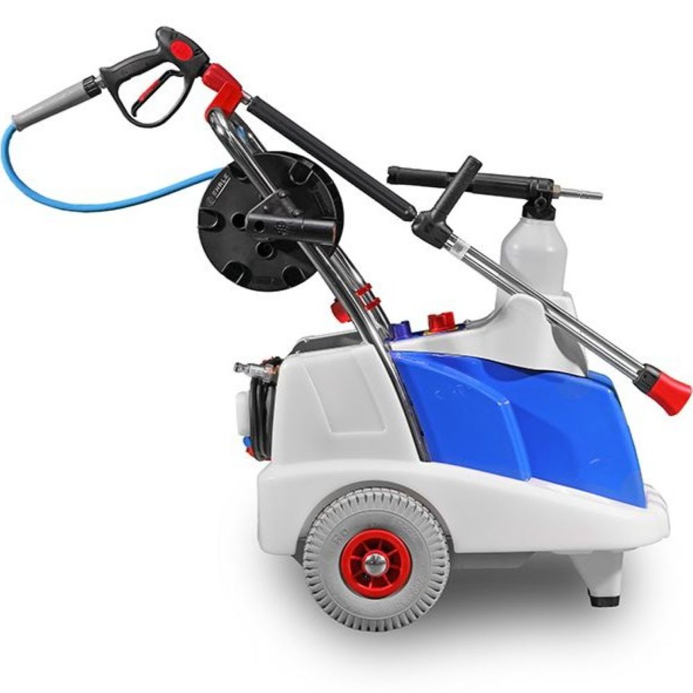 Urządzenie zostało wyposażone w wymienną, ergonomiczną rączkę ze stali nierdzewnej oraz system przechowywania wszystkich akcesoriów bezpośrednio na myjce, a wbudowany bęben na wąż wysokociśnieniowy zwiększa wygodę użytkowania w zakładach spożywczych.