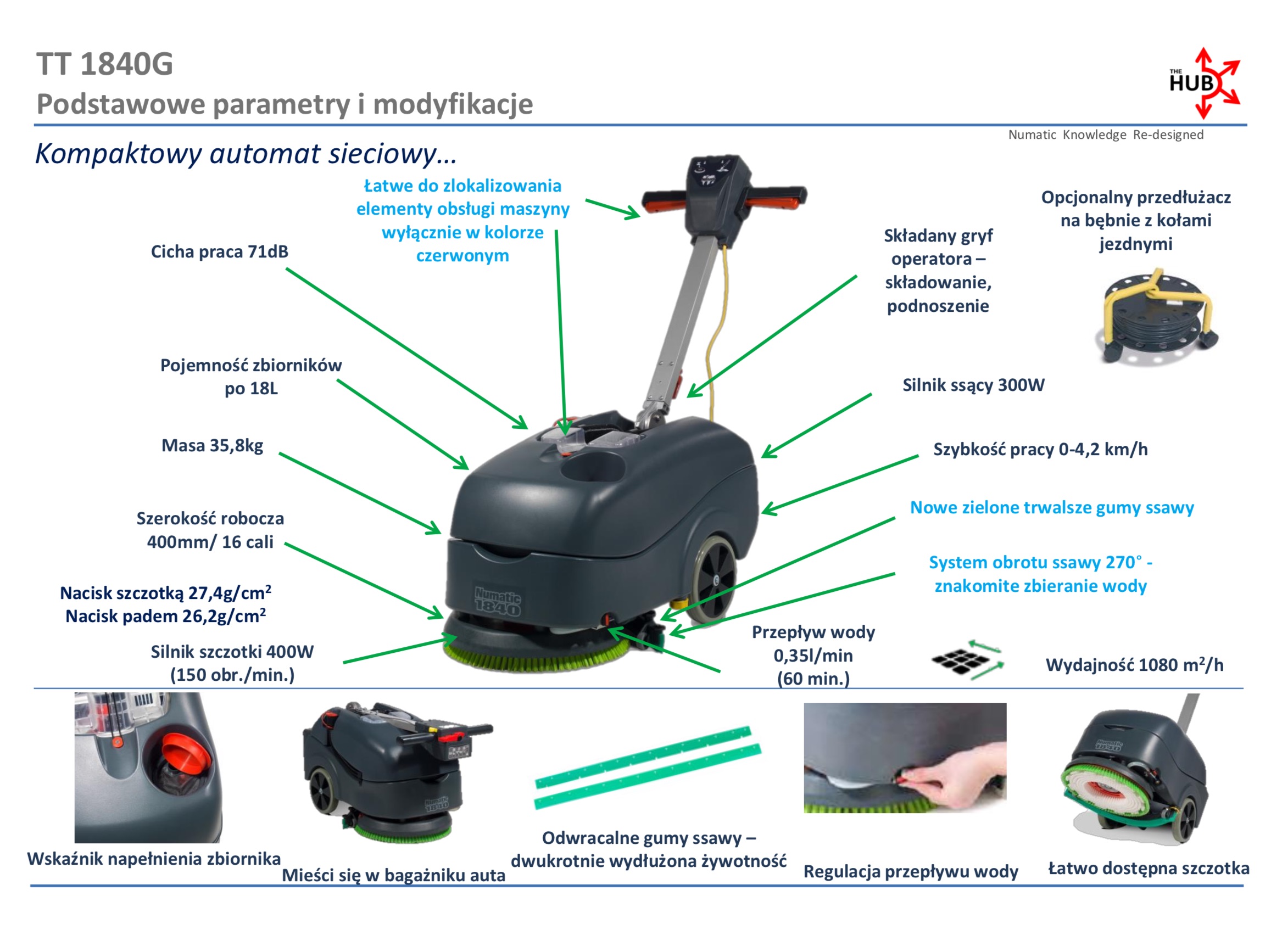 Numatic maszyna czyszcząca TT 1840G wyróżnia się szeregiem praktycznych rozwiązań, które znacząco ułatwiają codzienną pracę: