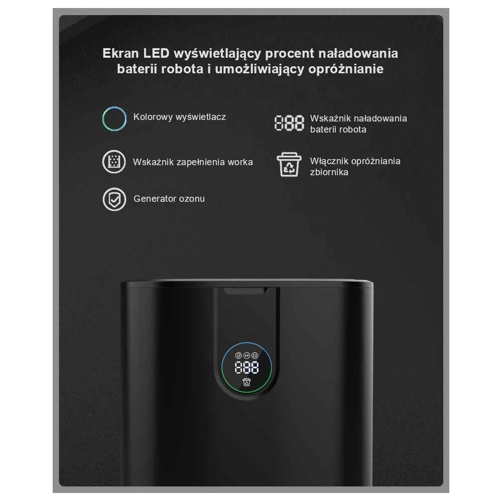 Urządzenie wyposażono w ekran LED, który wskazuje poziom zapełnienia worka i naładowania baterii. Za jego pomocą można również ręcznie opróżnić zbiornik. W trybie "nie przeszkadzać" ekran wyłącza się, aby nie zakłócać spokoju nocą.