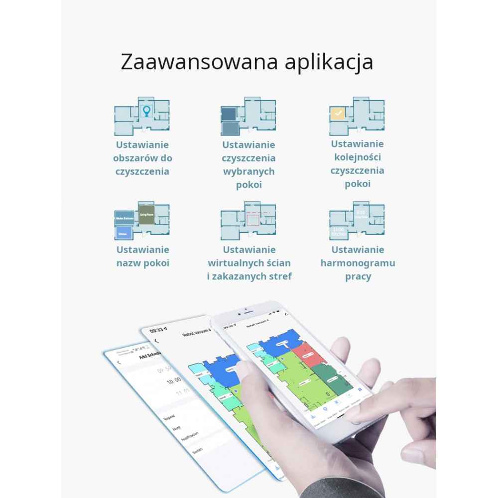 Robot perfekcyjnie planuje swoją pracę i trasę, usuwając napotkane zanieczyszczenia z różnych powierzchni.Dzięki laserowemu skanowaniu pomieszczeń i zaawansowanym funkcjom aplikacji,