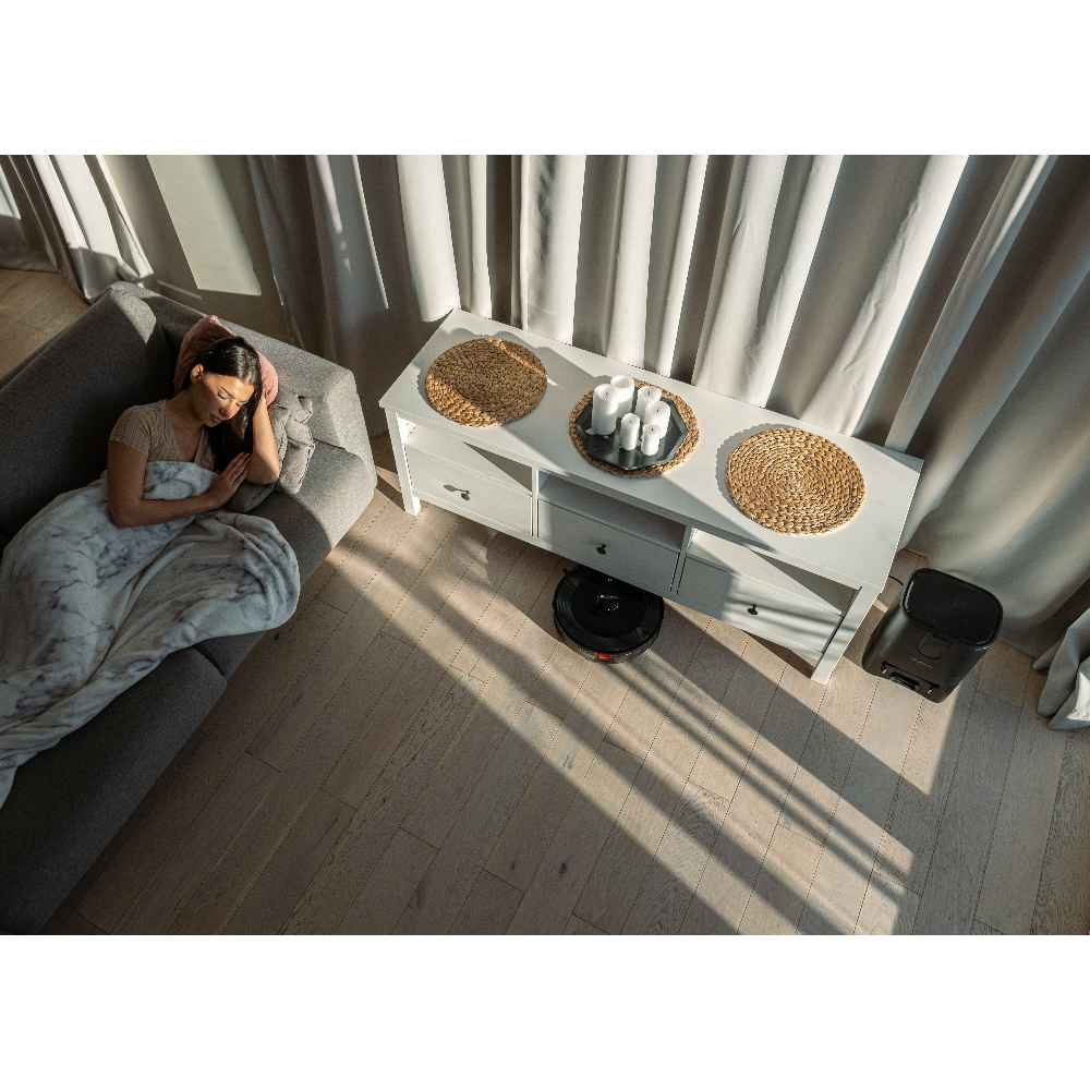 Pod robotem znajduje się lampa UV, która podczas odkurzania dezynfekuje powierzchnię, eliminując bakterie i drobnoustroje. Następnie zanieczyszczenia trafiają pod szczotkę centralną i dzięki podciśnieniu są wprowadzane do zbiornika, skutecznie usuwając je z podłogi.