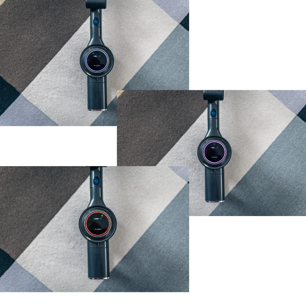 Panel odkurzacza automatycznie zmienia kolor i wyświetla odpowiednią ikonę, wskazując aktualny poziom mocy, co umożliwia wygodną kontrolę podczas pracy.