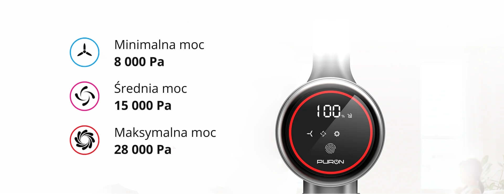 Model PURON PU50 PLUS wyposażono w ekran dotykowy, umożliwiający szybkie dostosowanie mocy do poziomu zabrudzeń i rodzaju powierzchni. Dzięki temu masz pełną kontrolę nad siłą ssania odkurzacza: